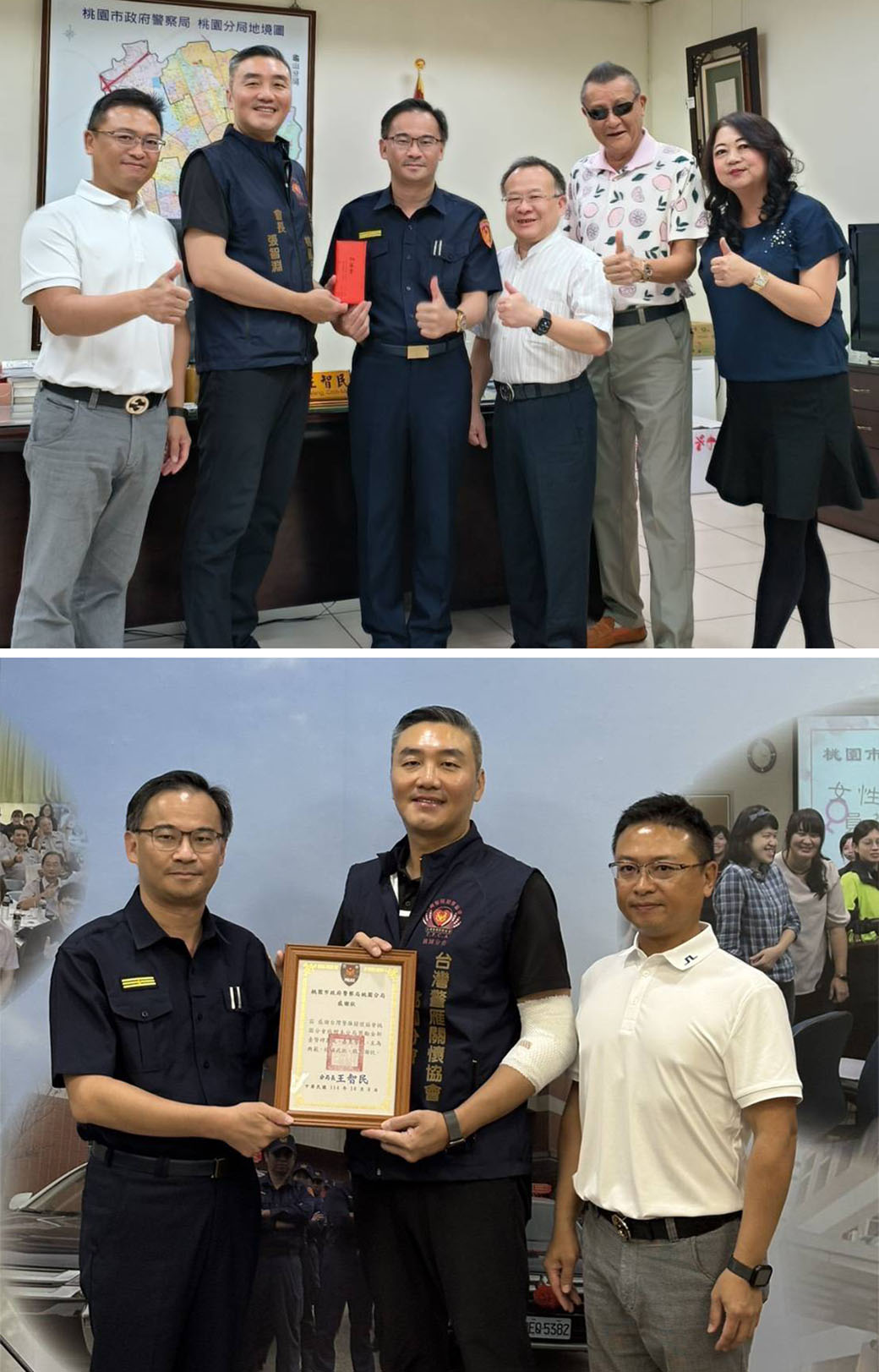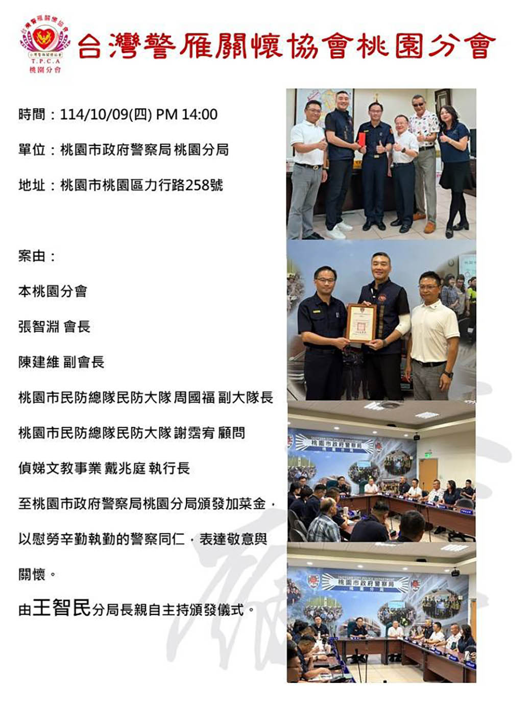 台灣警雁關懷協會桃園分會@ @頒獎行程@ 時間:114/10/09(四) PM 14:00 單位:桃園市政府警察局 桃園分局 地址:桃園市桃園區力行路258號 案由: 本桃園分會 張智淵 會長 陳建維 副會長 桃園市民防總隊民防大隊 周國福 副大隊長 桃園市民防總隊民防大隊 謝霑宥 顧問 偵娣文教事業 戴兆庭 執行長 至桃園市政府警察局桃園分局頒發加菜金, 以慰勞辛勤執勤的警察同仁,表達敬意與關懷。 由王智民分局長親自主持頒發儀式。