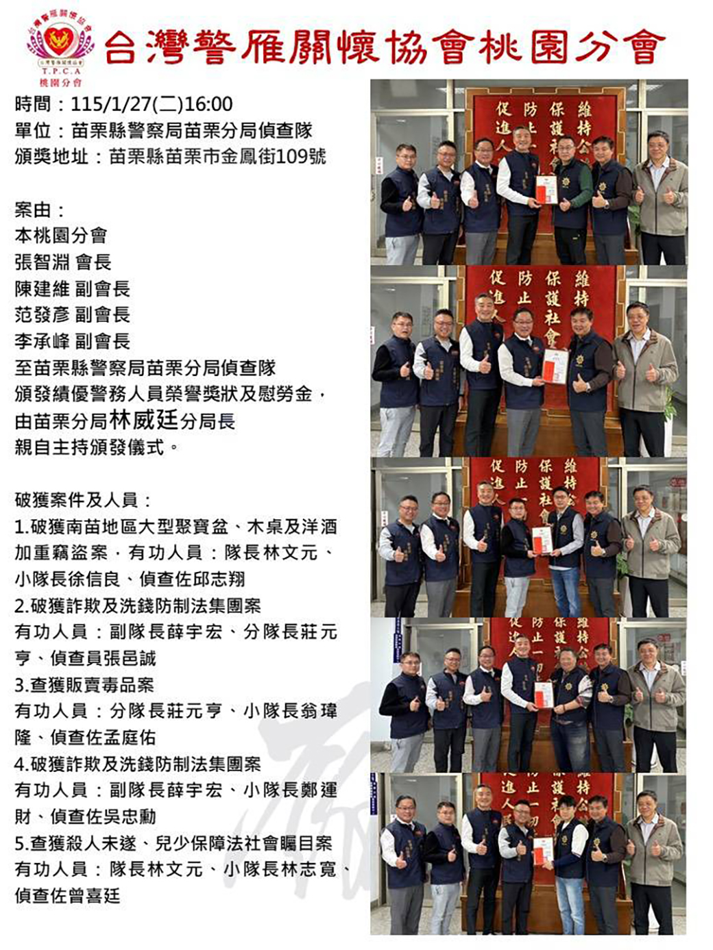 1.破獲南苗地區大型聚寶盆、木桌及洋酒加重竊盜案,有功人員:隊長林文元、小隊長徐信良、偵查佐邱志翔